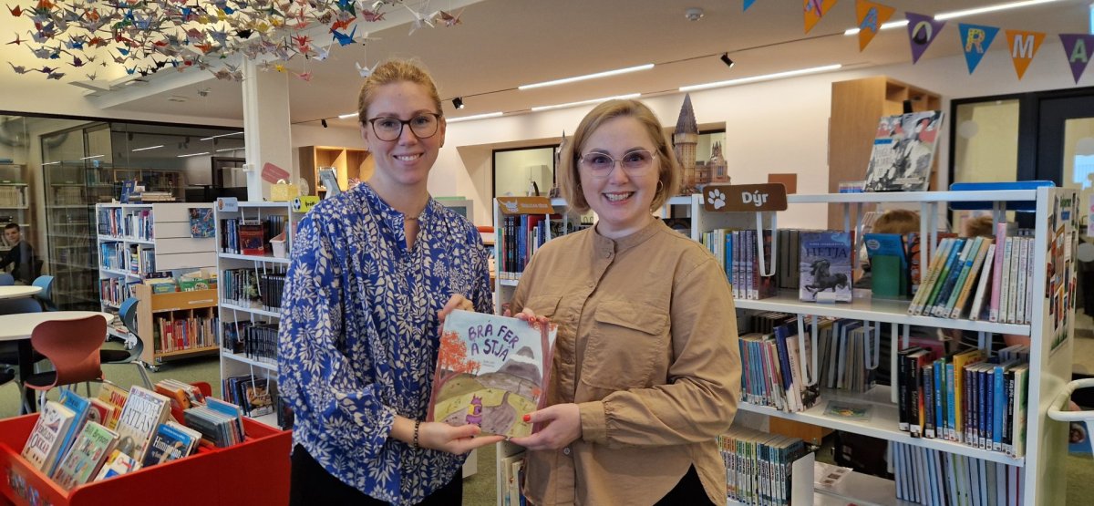 Á myndinni eru Jónella Sigurjónsdóttir skólasafnskennari Brekkubæjarskóla og Guðný Sara Birgisdóttir höfundur bókarinnar.